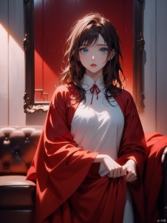 a young Asian girl with dark brown hair and blue eyes stands in front of a mirror. She is wearing a white long-sleeved t-shirt, adorned with a white collar. Her lips are painted a vibrant red, adding a pop of color to the scene. The backdrop is a stark white wall with a brown frame, and a maroon sofa with a red blanket draped over it. The sofa is positioned in a dimly-lit room, with a tassel hanging from the left side of the frame.
