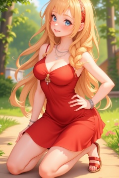 masterpiece, (best quality), vibrant colors ,natural lighting ,RTX, perfect proportions, beautiful, detailed face, (perfect eyes:1.1) ,(photorealistic:1.1), 8k uhd, outdoors, simple background, Layla Alstromeria, 1girl, solo, long hair, smile, blonde hair, dress, jewelry, braid, hairband, red dress, sandals, Kneeling with both hands on thighs,pastelz