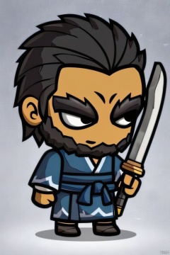 solo, black hair, 1boy, holding, weapon, male focus, sword, chibi, holding weapon, facial hair, beard