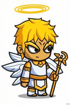 solo, blonde hair, male focus, wings, dark skin, chibi, halo, staff, angel wings, angel