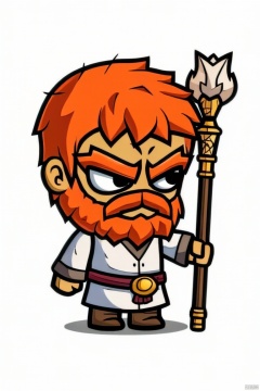 solo, shirt, 1boy, holding, standing, male focus, chibi, orange hair, facial hair, staff, beard, holding staff, scepter