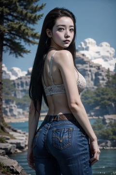 8K image. ((poakl)),黑神话悟空—亢金龙,1girl, solo, long hair, breasts, looking at viewer, large breasts, brown hair, bare shoulders, brown eyes, underwear, standing, panties, ass, cowboy shot, outdoors, parted lips, sky, day, looking back, pants, cloud, water, from behind, bra, tree, blue sky, lips, makeup, back, denim, white bra, jeans, blue pants, red lips