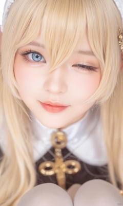 masterpiece,bestquality,1girl,aponia (honkai impact), long hair between eyes,blonde hair,half_closed_eyes,blue eyes, nun,large breasts,thick white stockings,choker, simple background,head tilt,blush,seductive smile,close-up,