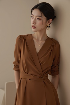 tianhai girl, photograph, woman in a long, brown dress, leaning against a textured wall, soft lighting, serene expression, dark hair styled in a sleek updo, gold hoop earrings, delicate necklace, subtle makeup, neutral background, elegant and poised.<lora:光影人像v2.0:0.8>