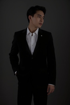 tianhai boy, photograph, young man in a black suit with a white shirt, standing against a dark gray background, contemplative expression, hand resting on his hip, short dark hair, minimalistic lighting, elegant and poised demeanor.<lora:光影人像v2.0:0.8>