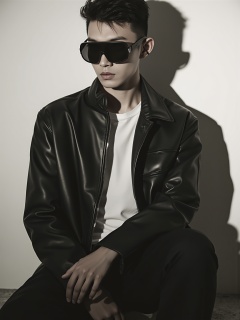 tianhai boy, photograph, young man with short hair, wearing a black leather jacket, sunglasses covering his eyes, white t-shirt, soft lighting, serious expression, shadow cast on the wall, urban setting, minimalist fashion.<lora:光影人像v2.0:0.8>