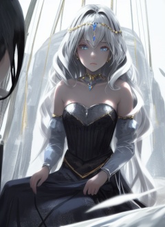 (masterpiece), (best quality), illustration, ultra detailed, hdr, Depth of field, (colorful), loli,a girl ,solo,bare shoulders,flat_chst,diamond and glaring eyes,beautiful detailed cold face,very long blue and sliver hair,floaing black feathers,wavy hair,black and white sleeves,gold and sliver fringes,a (blackhole) behind the girl,a silver triple crown inlaid with obsidian,(sit) on the black ((throne)), (depth) of (field), <lora:YouHua-000028:0.9>