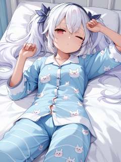 <lora:laffey_ii_pony_v1.0:0.8>,laffey_ii \(azur lane\), twintails,white hair, red eyes, ,half-closed eyes,pajamas, rubbing eyes,on bed, one eye closed,lying,, score_9, score_8_up, score_7_up, source_anime,
