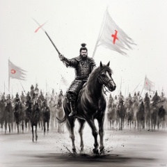 Wuxia a warrior from the ancient dynasty seated on a black horse holding a sword and a red arrow surrounded by a group of warriors holding flags and other weapons all in black and white dramatic and intense atmosphere intense and focused full-body shot low-angle shot dramatic lighting intense gaze historical and historical elements., ink painting, a painting of a man on a horse with a sword in his hand and a group of men on horses in the background, 1boy, holding, monochrome, weapon, greyscale, male focus, sword, holding weapon, armor, helmet, polearm, spear, riding, holding polearm, horse, horseback riding, letterboxed, spot color