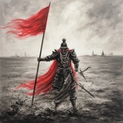 Photograph a warrior in armor stands in a turbulent sea holding a red flag and a sword with a black handle wearing a chain with a pendant dark and ominous mood dark cloudy sky waves and distant ships in the distance and the red flag billowing in the wind., ink painting, a painting of a man with a sword and a red cape standing in the water with a cloudy sky behind him, solo, 1boy, holding, standing, weapon, male focus, from behind, cape, holding weapon, armor, helmet, polearm, spot color, spear, red cape, holding polearm, weapon over shoulder, floating cape, sword, katana