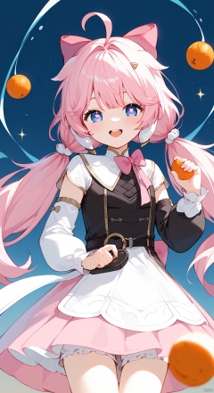 (score_9,score_8_up,score_7_up),1girl,(masterpiece:1.3),( beautiful:1.2),(high quality:1.2),(finely detailed:1.2),extremely detailed CG unity 8k wallpaper,best quality,a very delicate and beautiful,perfect fingers,(one cute girl at the center:1.2), 1girl, solo, long hair, looking at viewer, blush, smile, open mouth, bangs, blue eyes, skirt, shirt, hair ornament, long sleeves, dress, bow, twintails, ((pink bow)), white shirt, pink hair, ahoge, :d, heart, detached sleeves, teeth, virtual youtuber, hand up, symbol-shaped pupils,  low twintails, pink skirt, white dress, black dress, multicolored dress, black belt, mandarin collaromers, white bloomers,encore