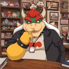 Bowser is in an office environment, leaning on a desk with a thoughtful expression, his chin resting on his hand. Dressed in a casual t-shirt featuring a stylized cartoon mouth and an ID badge around his neck, he also wears a black jacket. The background is detailed with various Nintendo-themed items, including plush toys on shelves, framed pictures, and familiar characters like Piranha Plants. The art style is colorful and vibrant, characterized by smooth lines and a rich palette, conveying a relaxed yet playful atmosphere within the space.