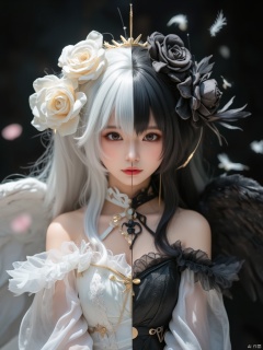 huihui,(The girl looks in the mirror. Outside the mirror, the girl has white wings, white hair, white clothes, light halo, and a white color tone. Inside the mirror, the girl has black wings, black hair, black clothes, light halo, and a black color tone of 1.5.) (Symmetry:1.3),split (black and white split:1.3),black and white **********,European style gorgeous and complex mirror,(6 years old.) Q-version,doll face,3 head body,ancient spirit and quirky,red lips:1.3),exquisite makeup,(selected perspective:1.5),(scattered feathers:1.3),(scattered small light particles:1.2),overexposed,off shoulder,floral hair,dress,fluffy long sleeves,fluffy sleeves,rose petals,mandala,chaotic,radial,streamlined,typographic art,multicolored pupil space,high exposure,exquisite headwear,dressed in formal attire,looking at the audience,feathers,gorgeous,looking at the audience,flowing hair,random beams,spots,strong light,exposed Back beam,dreamy light and shadow,backlight,ultra-high saturation,masterpiece,best quality,detailed details,high contrast,ultra-high definition,8K,wallpaper,