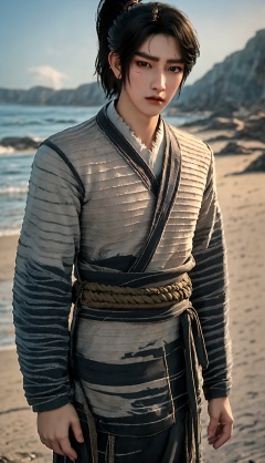solo,blurry background,black hair,looking at viewer,realistic,outdoors,black eyes,lips,closed mouth,scar,short hair,ponytail,day,<lora:Chenpingan Boy_20240906021908:0.8>,1boy,<lora:20240601-1717253745719:0.7>,<lora:美颜lora:0.6>,old,ponytail,cowboy_shot,medium_shot,on the beach,<lora:hanfu_20231118200453:0.8>,