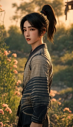 solo,blurry background,black hair,looking at viewer,realistic,black eyes,lips,closed mouth,scar,short hair,ponytail,day,<lora:Chenpingan Boy_20240906021908:0.8>,1boy,<lora:20240601-1717253745719:0.7>,<lora:美颜lora:0.6>,old,ponytail,cowboy_shot,medium_shot,<lora:hanfu_20231118200453:0.8>,starry sky,flowers meadows,