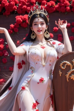 An woman in a white dress with a crown on her head. The woman's dress is adorned with red flowers and gold accents. She has long black hair and gold earrings. She is standing in front of a backdrop of red flowers. Her arms are raised in the air and she is holding a brown shield in her right hand. The shield has gold accents on it.