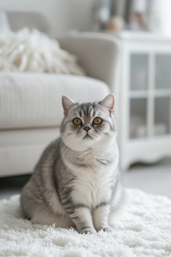 A gray and white striped cat is sitting on a white fluffy blanket. The cat's eyes are yellow and its ears are perked up. Behind the cat is a white couch with a white blanket on top of it. To the right of the couch is a window that has a white frame. There are two decorative items on the top of the window.