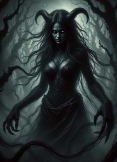 female   aswang, medium-sized humanoid, predatory appearance, shapeshifter, sharp, feral features, claws and fangs, glowing eyes, keen sense of smell, heightened senses, dark ominous presence, sinister malevolent expression