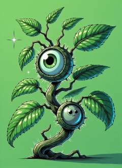 eyes, tiny cyan clump-forming climbing plant, fluted texture flexuous thorn, flaky, circular parallel-veined leaf, longitudinal venation, whorled, pinnatifid leaf margin,  silver legume fruit, fibrillose, epicalyx, opposite,