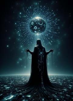 tech, scifi, solarpunk,  male priest, purification spells   pulsating, abyss-like orb, core a mesmerizing void, drawing in all essence, the fabric of reality appears to warp and bend, creating a sensation of looking into an endless, starless night