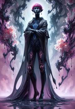 DonM5h4d0wM317FX, shadow melt,  female male cleric, ai entities, self-aware artificial intelligence with high-level cognitive abilities, aging gracefully tall, sub-saharan african, violet eyes, attached ears, button nose, double chin,    long face shape,    , red caesar cut hair, gratitude, confident stance, character stands tall with arms crossed, exuding confidence,  wearing  programmable bioluminescent pants,  cyber-silk kimono,    , quantum blur, character stands in a dynamic, blurred pose, as if phasing in and out of reality due to quantum manipulation, post-cyberpunk,