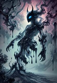 DonM5h4d0wM317FX, shadow melt,  compact scaled alienesque bohemian crystalline entity, 1 leg decamanual, multi-jointed appendages, quadrifurcated-tailed, curved-tailed, luminescent skin,      # elongated horns,  # tentacled mouth, circuitboard pattern, ,