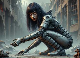 female beastmaster, retirement age, athletic, greek, turquoise eyes, unique chin, u-shaped jaw, round cheeks, symmetrical forehead, rectangular face shape, , black blunt bangs hair, regret, stealthy crouch, character crouches low, arms outstretched, and eyes alert, adopting a stealthy pose, wearing nano-weave capri pants, solar-polymer holographic strata texture orchid robo-lace leggings, holo-mesh sock sneakers, neural implant headband, , shooting stance, character holds an imaginary firearm with arms outstretched, ready to shoot, steampunk-cyberpunk fusion