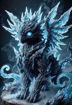 DonMGl00my1c3FX, black ice,  tiny bioluminescent scaled whimsical amorphous individual, 1 leg single-armed, plantigrade appendages,  bushy-tailed, fur,    icarus wings (enchanted wings made from wax and feathers),  #   #  webbed pattern,