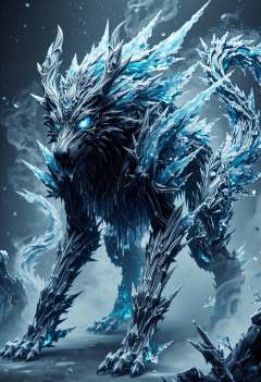 black ice,  huge nocturnal plasmic biomimetic canine creature, octopod bimanual, webbed appendages, quadrifurcated-tailed, bushy-tailed, fuzzy fur,      # branched horns,  #  indigo,