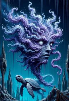donmw15pFX floating wisp head made of lilac eclipse necrotic,   harbor,sea turtle,,stalagmite,cornice, <lora:FLux\donmw15pFX-000009.safetensors:0.8>,