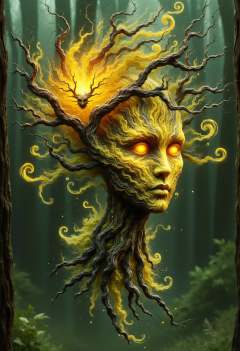 donmw15pFX floating wisp head made of yellow gusty holy,   haunted forest,astral plane,,hearth,bacon strip, <lora:FLux\donmw15pFX-000009.safetensors:0.8>,