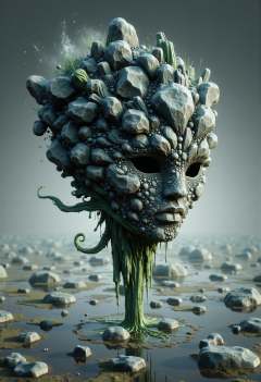 donmw15pFX floating wisp head made of slategray rocky blood,   alien planet,oasis,,water fountain,wetland ecosystem, <lora:FLux\donmw15pFX-000009.safetensors:0.8>,