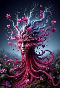 donmw15pFX floating wisp head made of quinacridone red fertile troll,   fields,bog orchids,,twilight,celestial mechanics, <lora:FLux\donmw15pFX-000009.safetensors:0.8>,