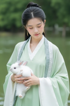 In a close-up shot, a young Asian woman wearing Hanfu is seen wearing a light green dress and a white shawl draped over her shoulders. She held a white rabbit in both hands,. Her hair was tied in a ponytail and she wore a pair of gold earrings, adding a touch of color to her face. The background is blurry, implying a natural environment and creating a sharp contrast