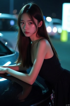 A girl with delicate facial features, straight brown hair, wearing a black sleeveless dress, is leaning on the hood of a black car. Her left hand is resting on the car's hood, adding a touch of balance to the image. The background is blurred, creating a stark contrast to the woman's black dress.Trendy K Style, neon lighting,
