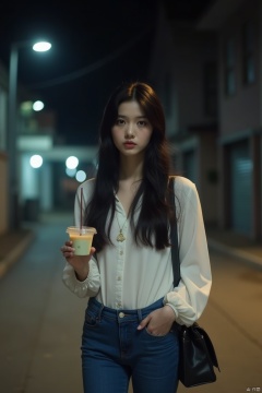 The image is a portrait of a young woman standing on a street at night. She is holding a drink in her left hand and a handbag in her right hand. The woman has long dark hair and is wearing a white blouse and blue jeans. She has a serious expression on her face and is looking directly at the camera. In the background, there are buildings and a street lamp. The overall mood of the image is dark and mysterious.