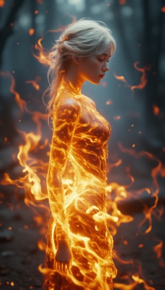 <lora:FL-bailing-24-0906Fire Spirit-000008:0.7>,bailing_fire,a girl made up of the element fire,1 woman,a person who appears to be on fire with flames engulfing their body.,magic swordsman,A girl made entirely of flames stands,her body engulfed in fire. Her form flickers and sways,semi-transparent and composed entirely of fire elements. The flames seem to rise naturally from her,as though she is both part of the fire and its source. The surroundings are blurred,keeping the focus entirely on her fiery presence. The flames ripple and pulse,wrapping around her form,creating an intense yet surreal atmosphere.,(white hair:0.3),freckles,masterpiece,best quality,light particle,depth of field,fantasy,a cute girl,Porta 160 color,shot on ARRI ALEXA 65,bokeh,sharp focus on subject,highest details,photorealistic,high background details,high face details,8k,raytracing,head_tilt,ultra wide,octane render masterpiece,