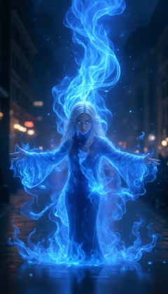 <lora:FL-bailing-24-0906Fire Spirit-000008:0.7>,bailing_fire,composed of fire elements,fire element,girl made of blue flames,Fire Skin,surrounded by blue flames.,blue fire,blue flame,the person in the image is a young woman with long blonde hair and striking blue eyes.,she is standing in a dark room with a cityscape blurred in the background. the woman is surrounded by a bright blue aura that seems to be emanating from her body.,her arms are outstretched and she appears to be in the midst of a fire powerful display of energy,