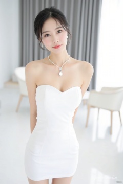 a woman stands in a white strapless dress, adorned with a white necklace and earrings. Her hair is styled in a sleek bob, and her eyes are a piercing blue. The backdrop is a stark white, with a gray curtain, and a white table and chair in the background. The floor is a glossy white, creating a stark contrast to the woman's dress.