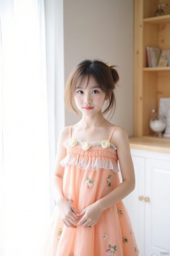 a young Asian girl stands in front of a window. She is wearing a peach-colored dress adorned with a floral pattern. Her hair is pulled back in a ponytail, adding a touch of brown to her face. Her eyes are a piercing blue, and her lips are pursed in a neutral expression. The backdrop is a stark white wall, with a wooden shelf to the right of the girl, and a white cabinet with a white knob on it.