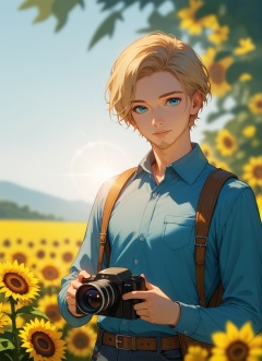 score_9,score_8_up,score_7_up,solo, looking at viewer, short hair, blue eyes, blonde hair, brown hair, shirt, long sleeves, 1boy, holding, upper body, flower, male focus, outdoors, day, collared shirt, belt, pants, bag, blurry, lips, blurry background, facial hair, sunlight, backpack, blue shirt, denim, realistic, yellow flower, camera, sunflower, holding camera
