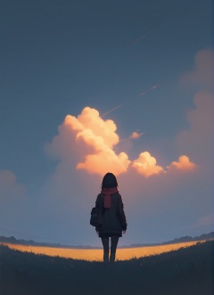score_9,score_8_up,score_7_up,1girl,solo,sky,cloud,outdoors,scenery,black hair,grass,from behind,long hair,standing,cloudy sky,dark,hood,sunset,bag,jacket,night,scarf,long sleeves,facing away,