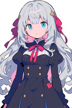 1girl, bangs, black_dress, blue_eyes, breasts, dress, grey_hair, hair_ornament, juliet_sleeves, long_hair, long_sleeves, looking_at_viewer, medium_breasts, parted_lips, puffy_short_sleeves, puffy_sleeves, simple_background, solo, upper_body, white_background