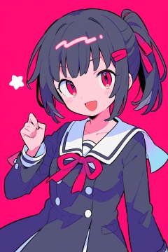 1girl, bangs, black_dress, black_hair, blush, breasts, collarbone, dress, eyebrows_visible_through_hair, folded_ponytail, hair_ribbon, long_sleeves, looking_at_viewer, open_mouth, parted_bangs, red_background, red_eyes, red_ribbon, ribbon, school_uniform, shinomiya_kaguya, short_hair, shuuchiin_academy_uniform, sidelocks, smile, solo