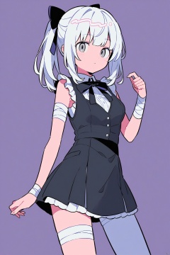 1girl, bandaged_arm, bandages, bangs, black_bow, black_ribbon, black_vest, bow, breasts,