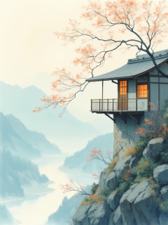 OBfencai,This is a digital artwork depicting a serene, tranquil scene of a traditional Japanese house perched on a cliffside overlooking a misty, mountainous landscape. The house, constructed of light grey wooden planks, features a small balcony with a wooden railing. The balcony is adorned with a warm, inviting orange light emanating from within the house, contrasting with the cool, muted tones of the exterior. The house is supported by sturdy wooden beams and has a simple, elegant design typical of traditional Japanese architecture.In the foreground, a leafless tree with delicate, red-orange branches extends over the balcony, adding a touch of color and life to the otherwise muted scene. The branches are painted with a soft, watercolor-**** texture, giving the impression of a gentle breeze rustling through them. The background reveals a tranquil river winding through the misty mountains, which are painted in shades of blue and grey, blending seamlessly with the soft, pastel sky.