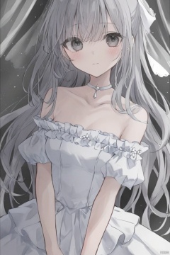 1girl,bare_shoulders,blush,bow,bridal_veil,collarbone,curtains,dress,eyebrows_visible_through_hair,frills,jewelry,long_hair,looking_at_viewer,off_shoulder,own_hands_together,solo,transparent,wedding_dress,white_bow,white_dress,white_theme