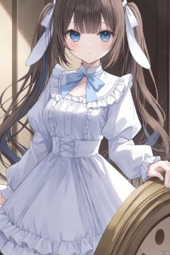 1girl, solo, long hair, breasts, looking at viewer, blush, bangs, blue eyes, brown hair, long sleeves, dress, bow, ribbon, animal ears, twintails, medium breasts, closed mouth, standing, hair ribbon, multicolored hair, frills, puffy sleeves, white dress, rabbit ears, capelet, frilled dress, blue ribbon, puffy long sleeves