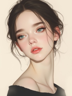 OBxiaoxiang,This is a digital illustration in a soft,ethereal style,featuring a young woman with a delicate,almost otherworldly appearance. She has fair,smooth skin with a light blush on her cheeks and a natural,slightly glossy sheen on her full,pink lips. Her eyes are a striking light blue,framed by thick,dark lashes,and she has a small mole on her left cheek. Her hair is dark brown,styled in a loose,tousled updo with a few strands falling softly around her face. She wears a simple,black top that contrasts with her pale skin,adding a sense of minimalism and focus on her face.The background is a soft,muted beige that fades into the distance,ensuring the viewer's attention remains on her. The illustration uses a blend of soft gradients and delicate lines to create a dreamy,almost surreal atmosphere. The overall color palette is muted with subtle highlights,giving the image a soft,almost dreamlike quality. The texture of her skin and hair is smooth and polished,enhancing the ethereal feel of the artwork. This image captures a moment of serene contemplation,with a blend of realism and fantasy.,