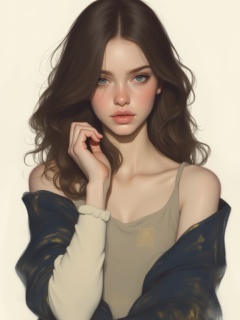 OBxiaoxiang,This is a digital painting of a young woman with an ethereal, dreamy quality. She has fair skin, striking blue eyes, and full, slightly parted lips. Her long, wavy dark brown hair cascades around her shoulders, framing her face. She is wearing a loose, off-shoulder top in a muted beige color, and a dark blue, patterned shawl draped over her shoulders. The shawl features a subtle, abstract design with hints of gold and dark blue, adding a touch of elegance. Her left hand is gently resting on her cheek, and her right arm is partially visible, covered in a cream-colored sleeve that contrasts with her dark hair and the dark blue shawl. The background is a soft, gradient white to light beige, which helps to focus attention on the subject. The overall style of the painting is soft and delicate, with a focus on subtle textures and soft, blended colors that create a dreamlike atmosphere. The artist's use of light and shadow enhances the subject's features and the softness of her expression. The image evokes a sense of tranquility and introspection.